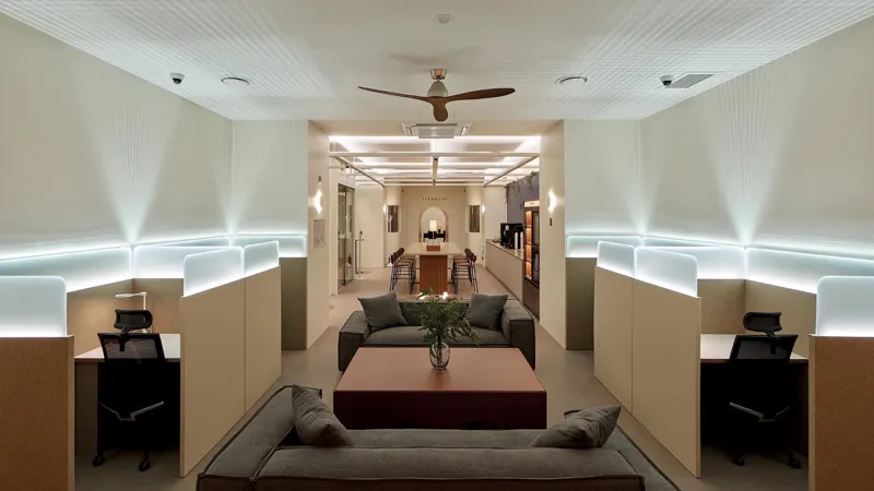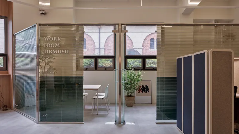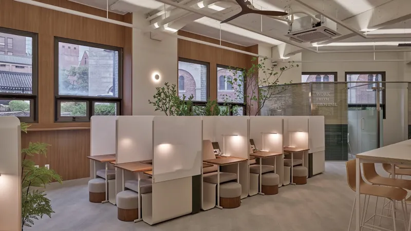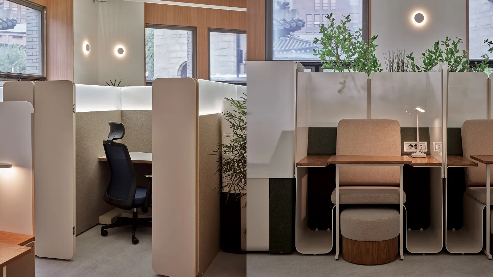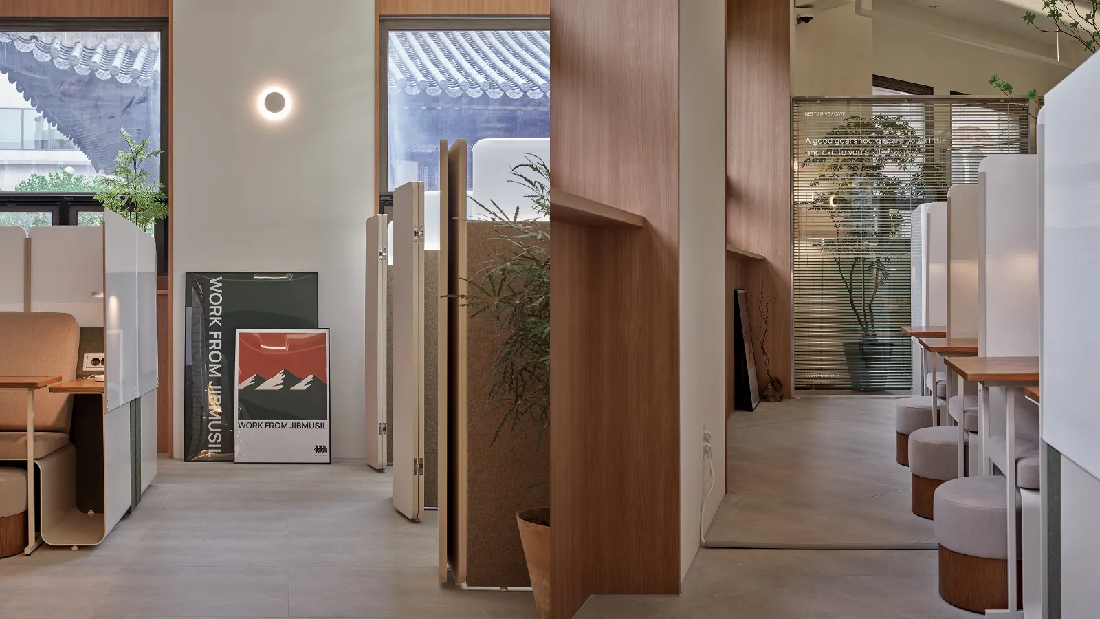 공간 디자인에서도 불필요한 요소를 과감히 줄이고 쾌적한 업무 환경을 조성하는 데 집중했습니다. 대표적인 예로 자체 제작한 세 종류의 '워크 모듈'이 있습니다. 이 워크 모듈들은 원격 근무자의 성향을 타입화하여 제작되었습니다. 또한, 기존의 코워킹 스페이스보다 차분하고 아늑한 분위기를 조성하여, 집무실의 장점을 극대화했습니다.